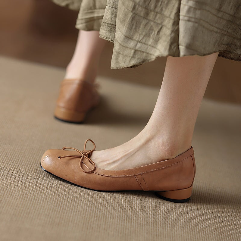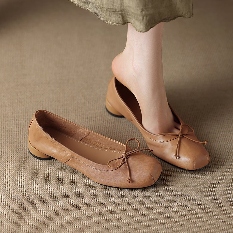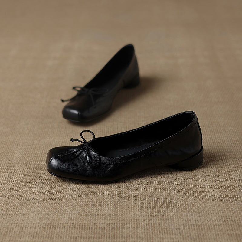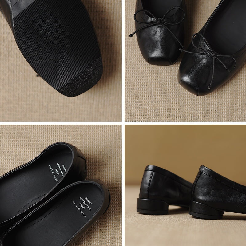 Handmade Vintage Square Toe Ballet Flats Bow-Tie Slip-On Leather Shoes in Black/Apricot