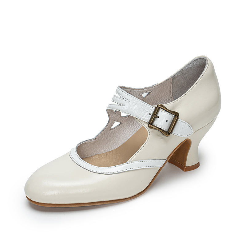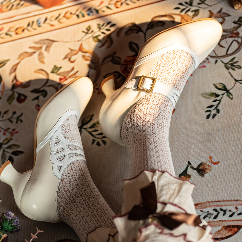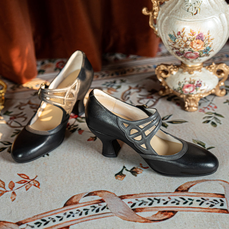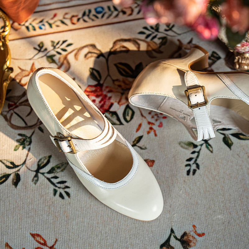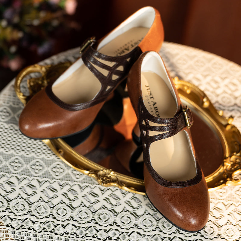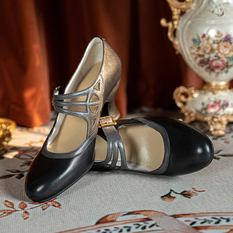 Handmade Vintage Two-Tone Mary Jane Pumps for Women with Metal Buckle in Black/Beige/Brown