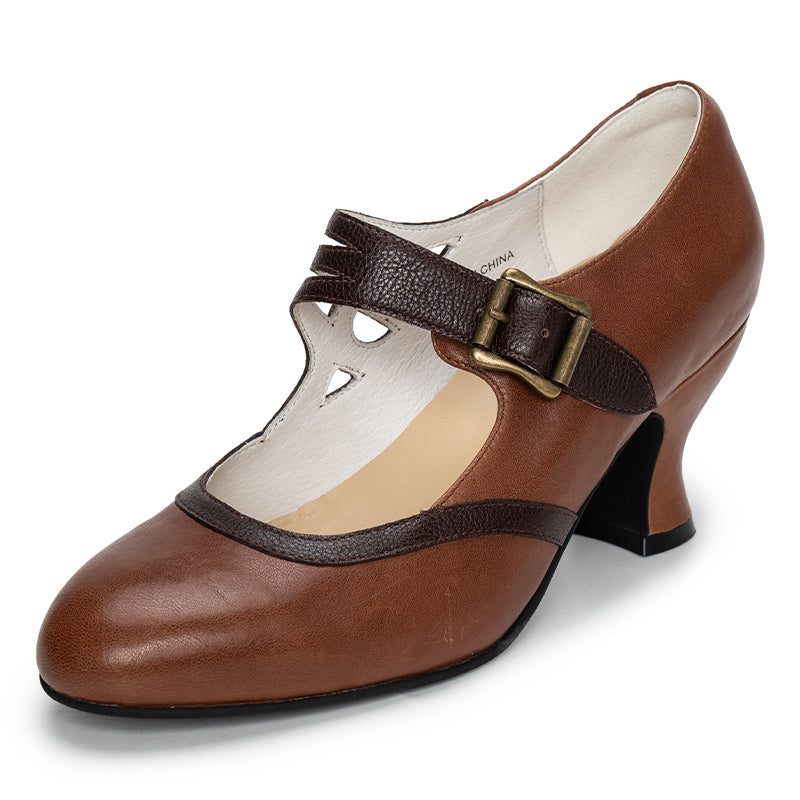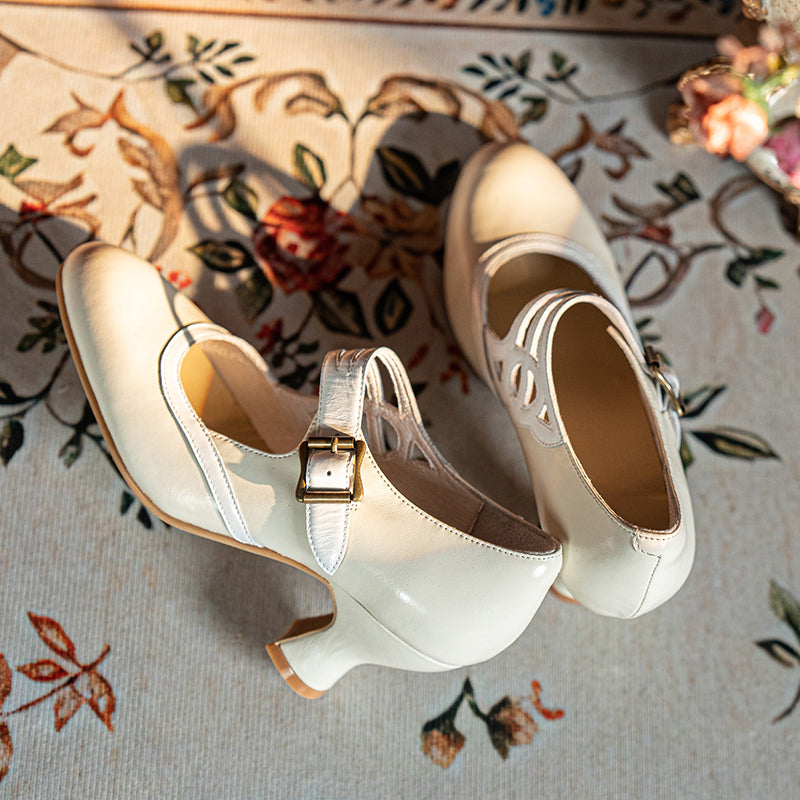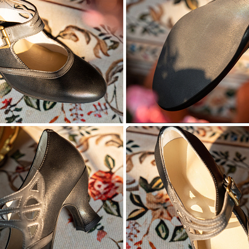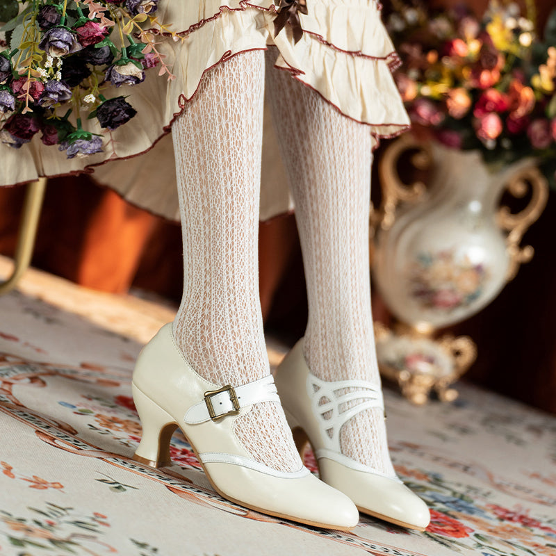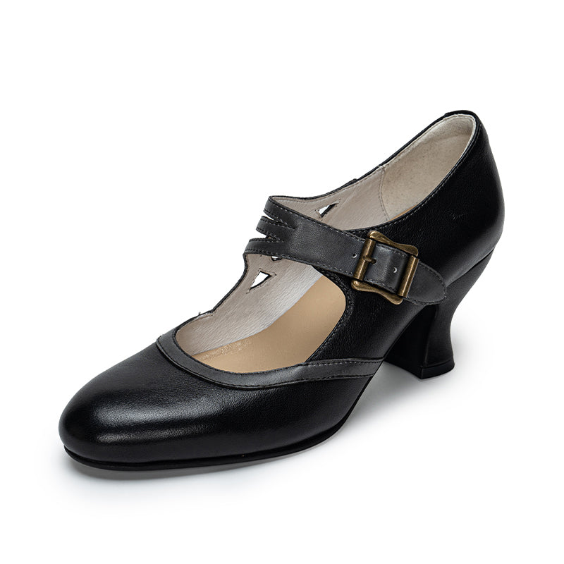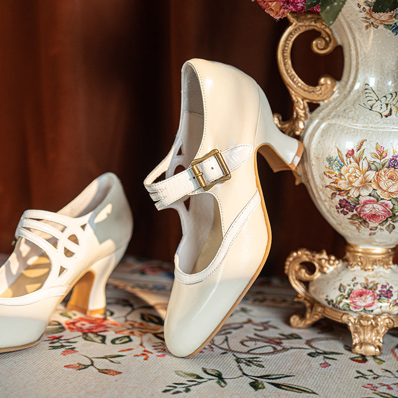 Handmade Vintage Two-Tone Mary Jane Pumps for Women with Metal Buckle in Black/Beige/Brown