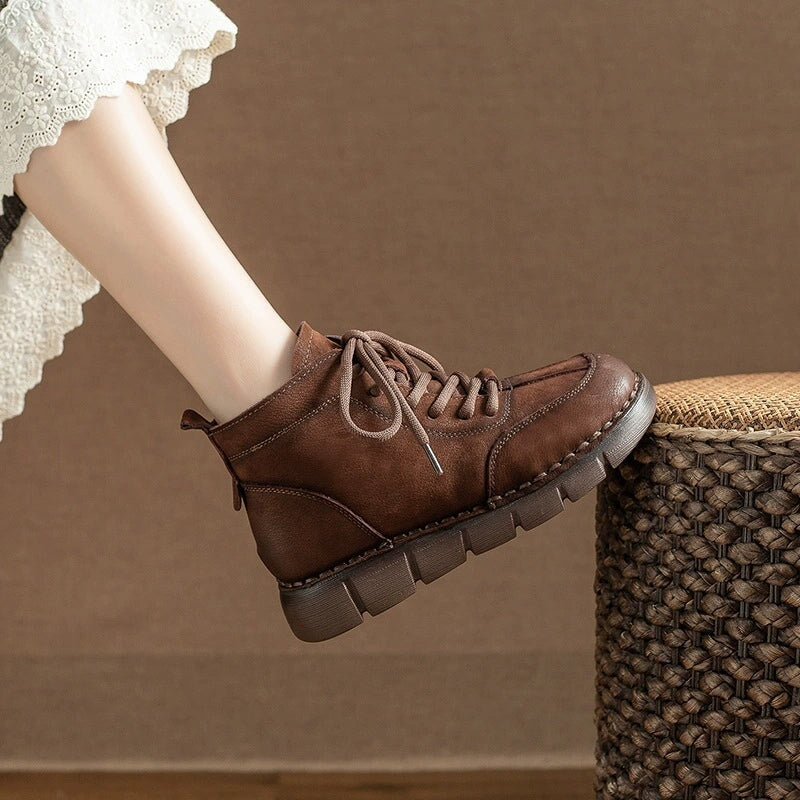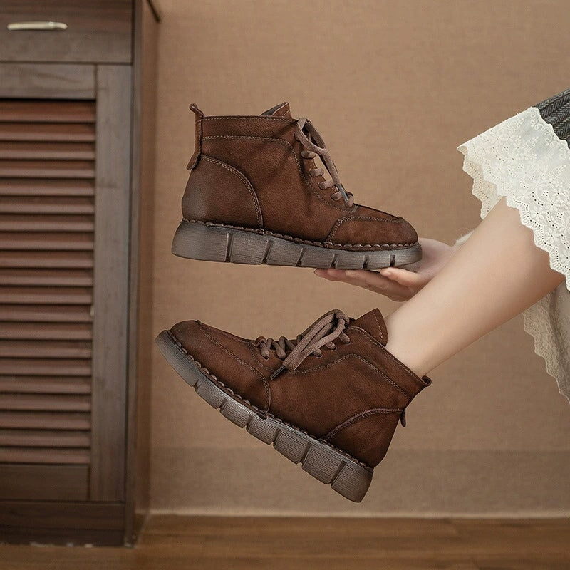 These handmade short Martin boots are crafted from top-grain cow leather and lined with soft artificial short plush for a warm, cozy feel. Designed with a round toe, lace-up front, and side zipper for easy wear, they feature a 40mm platform PVC sole that’s comfortable, durable, and non-slip. Perfect for cold weather, these boots combine style, comfort, and warmth in one versatile everyday design.