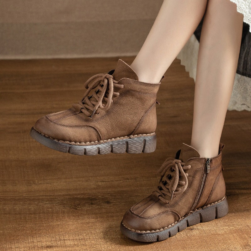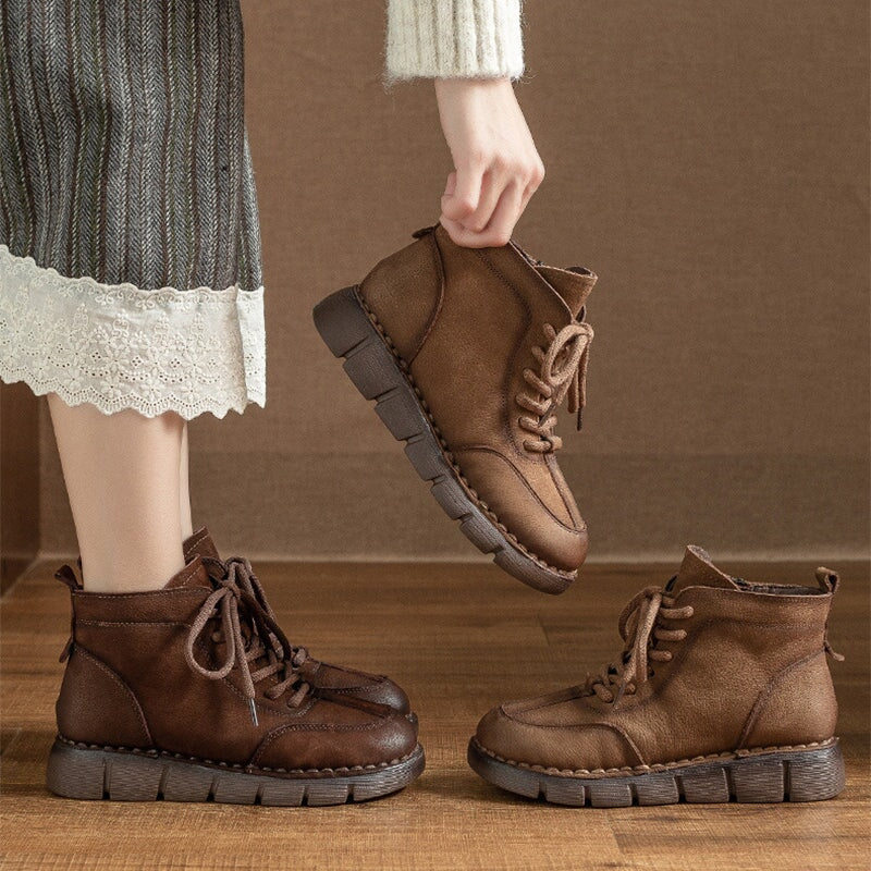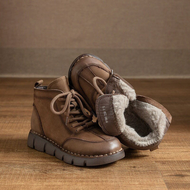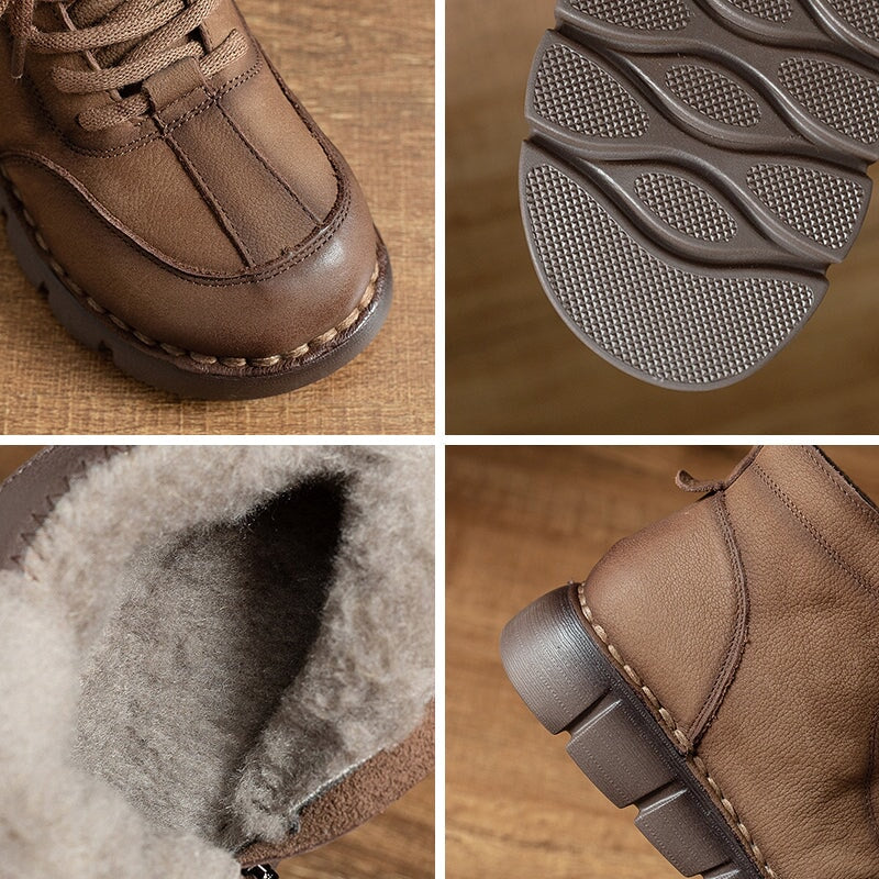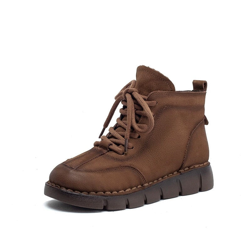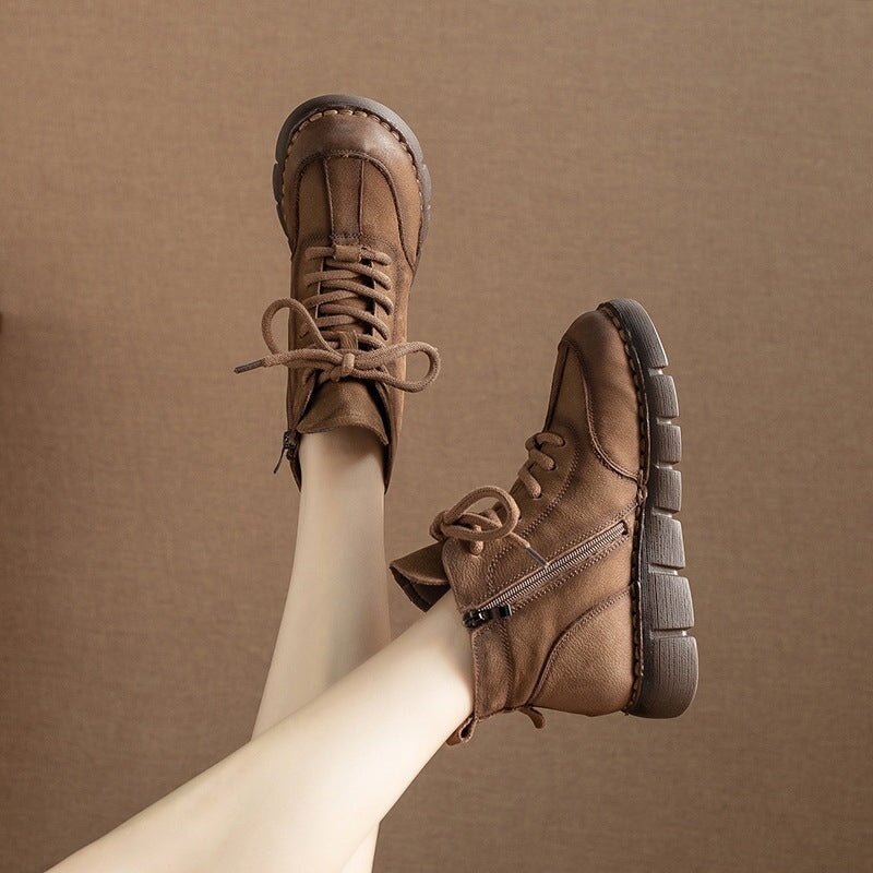 Handmade Warm Leather Martin Boots for Women with Short Plush Lining and Side Zip in Coffee/Khaki