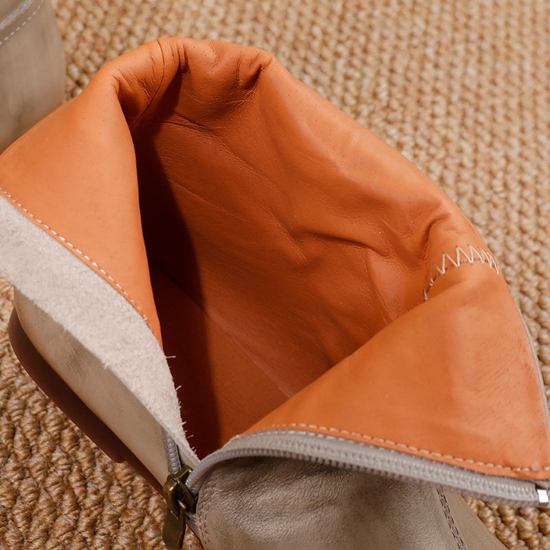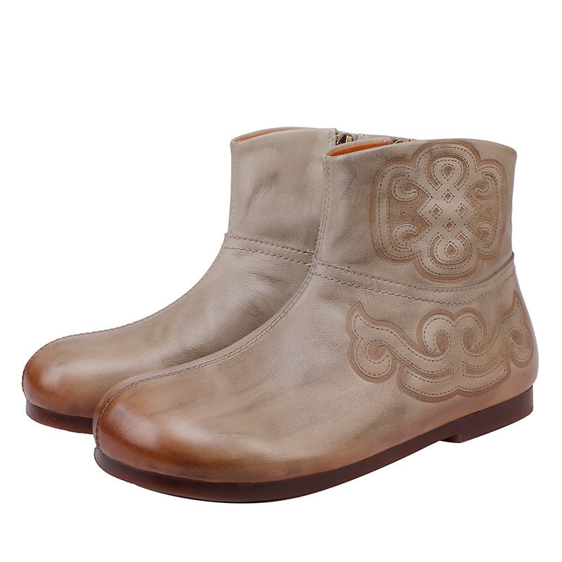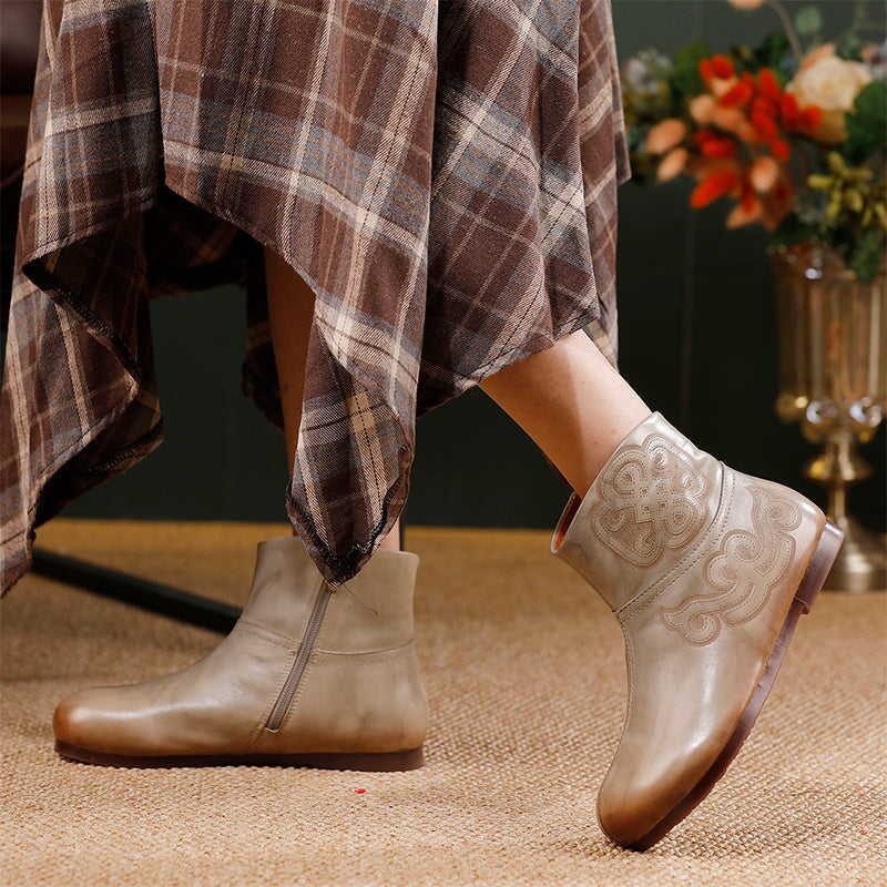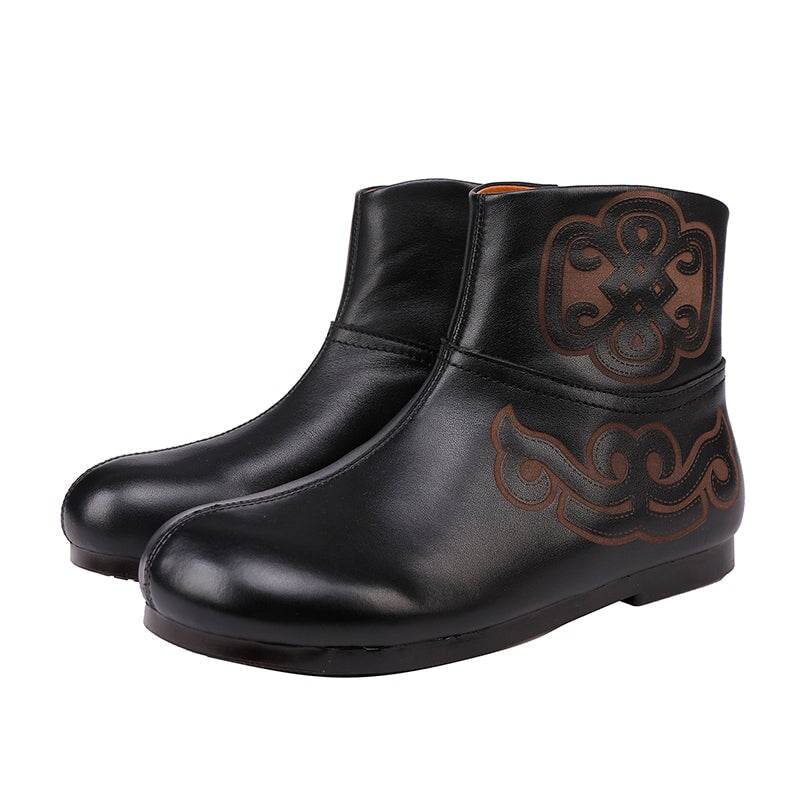 Women’s vintage short boots made from premium first-layer cow leather. Designed with a round toe, side zip, and unique electroplated pattern details for a retro yet fashionable look. Features a flat block heel and durable rubber sole that is highly elastic, soft, non-slip, and wear-resistant. Each pair is handmade and fixed by experienced craftsmen, offering comfort, durability, and style that can be worn for years.
