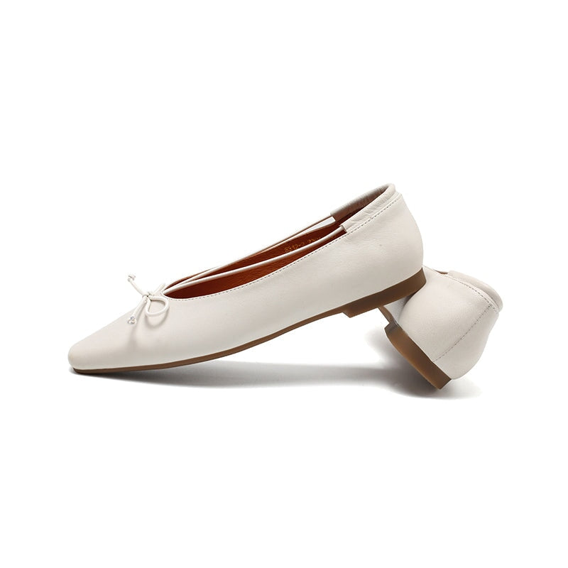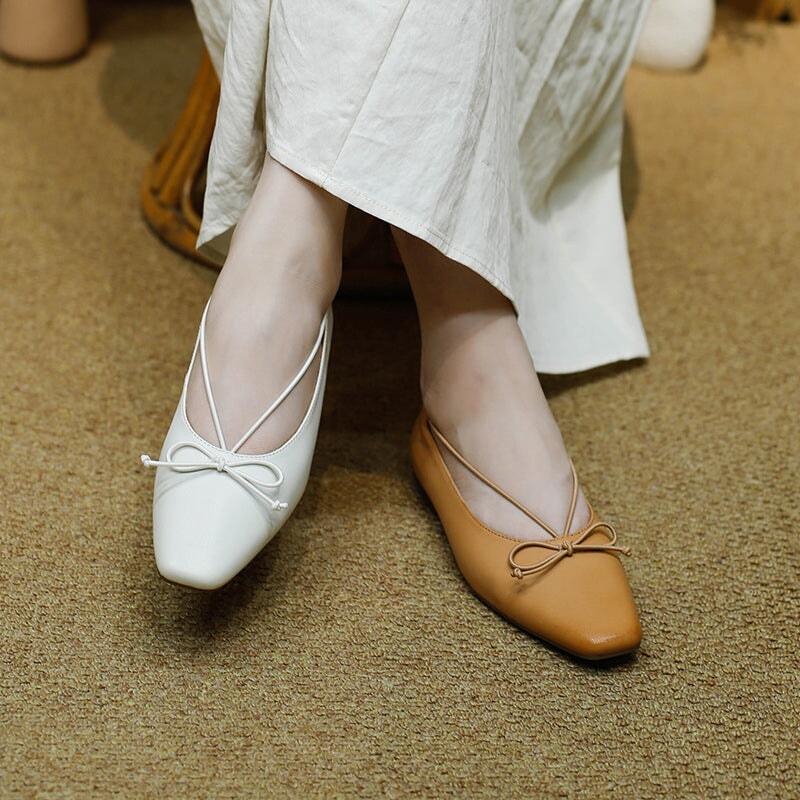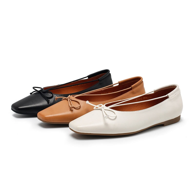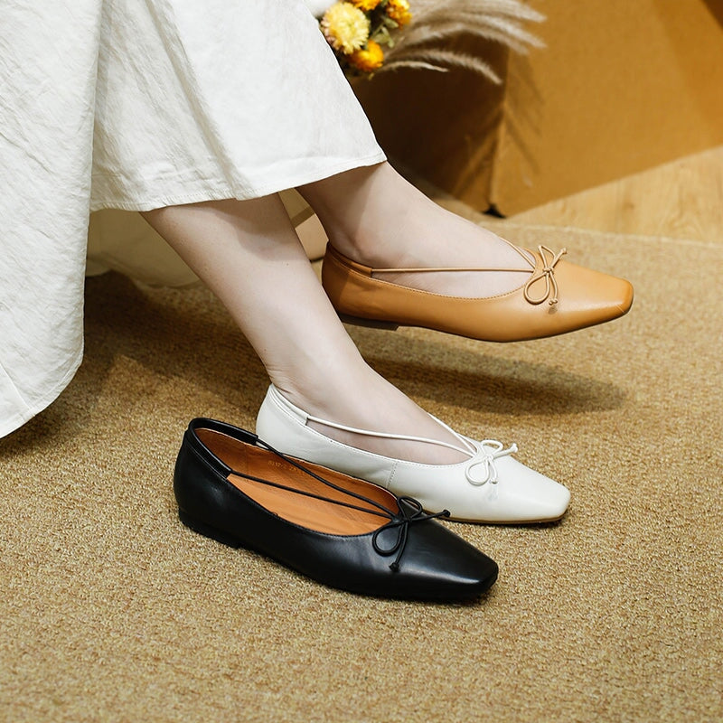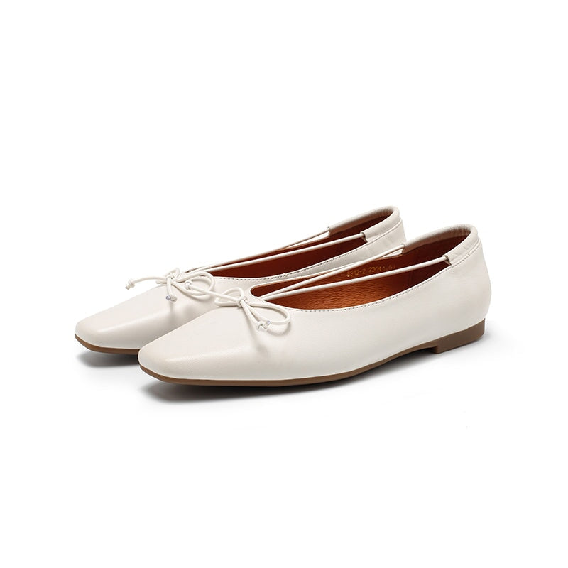 Dwarves Square Toe Bow Flat Shoes Soft Waxed Sheepskin Slip-On Ballerina Flats in White/Black/Light Brown