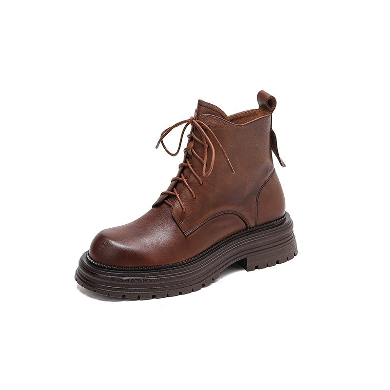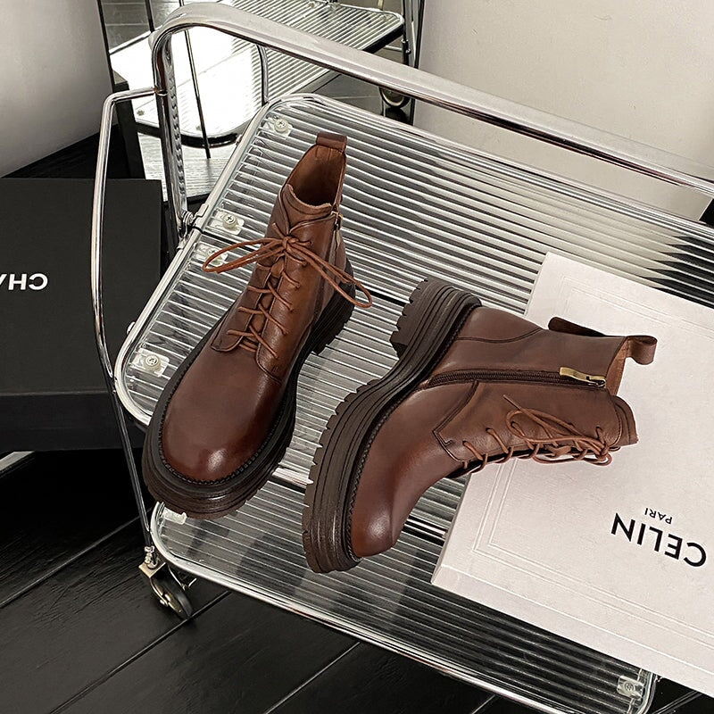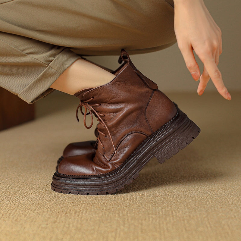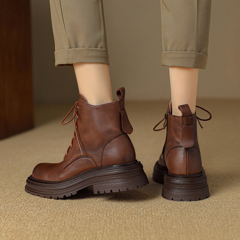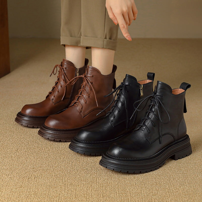 Crafted from premium water-dyed cowhide, these handmade vintage platform boots feature a round toe, side zipper, and lace-up design for easy wear. The TPR sole is soft, non-slip, and durable, with a genuine leather lining that keeps feet warm and comfortable all day. Stylish short combat boots that blend retro charm with everyday comfort.