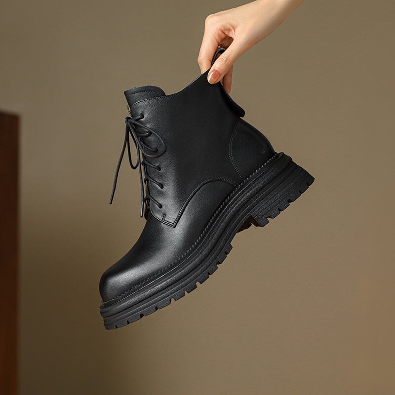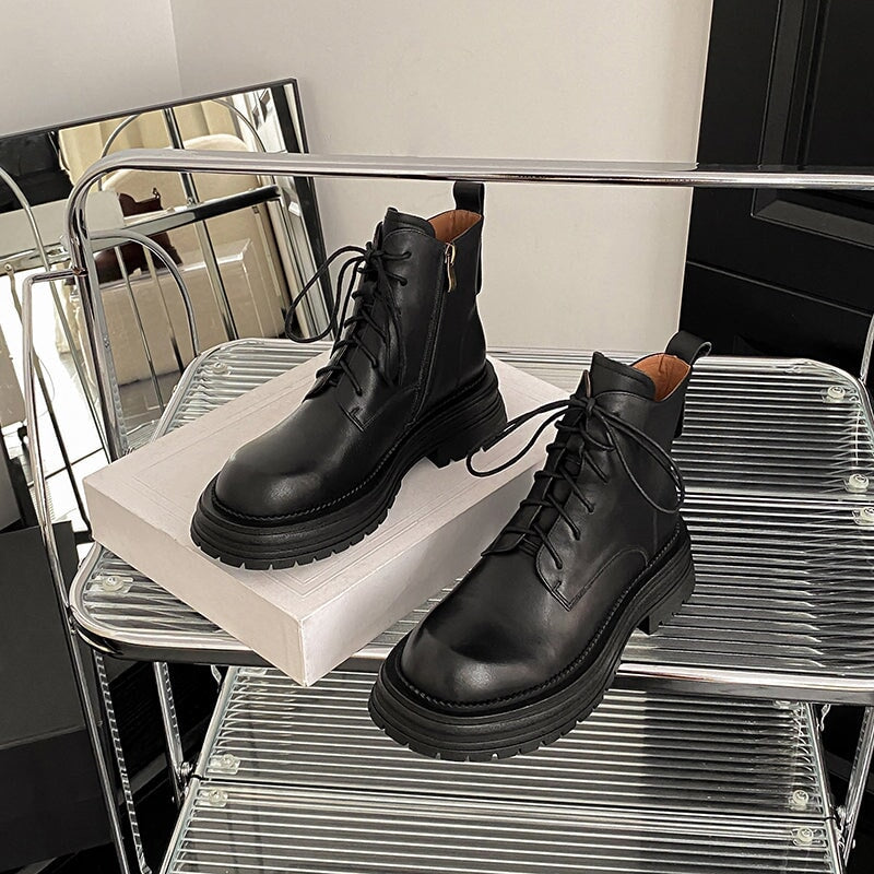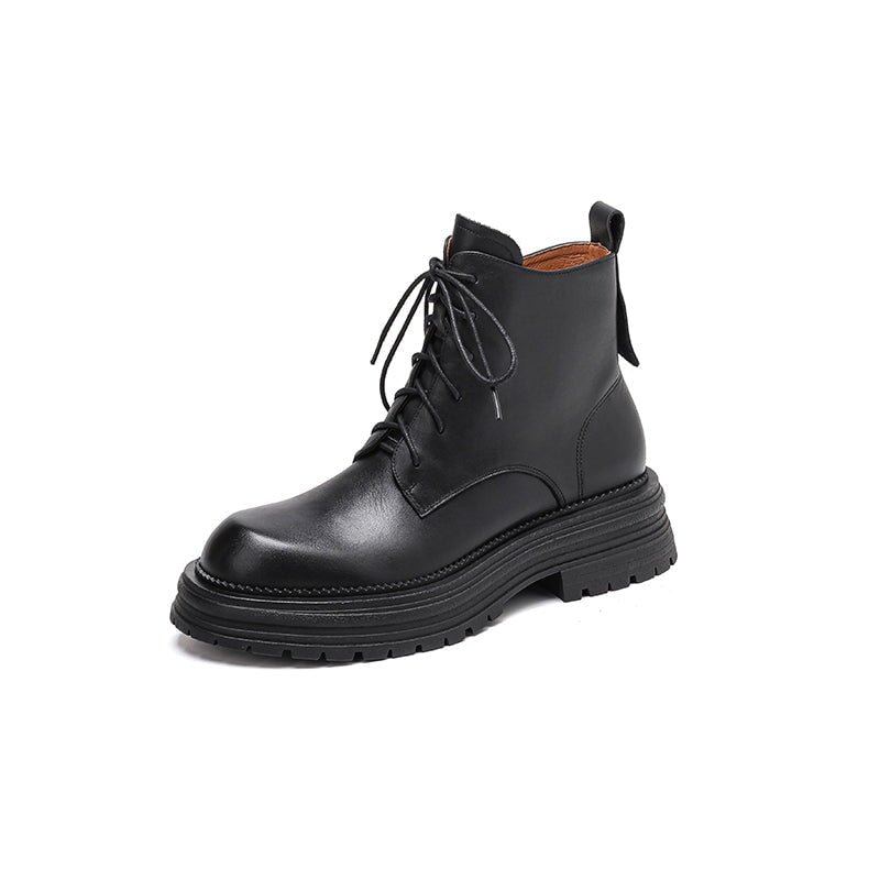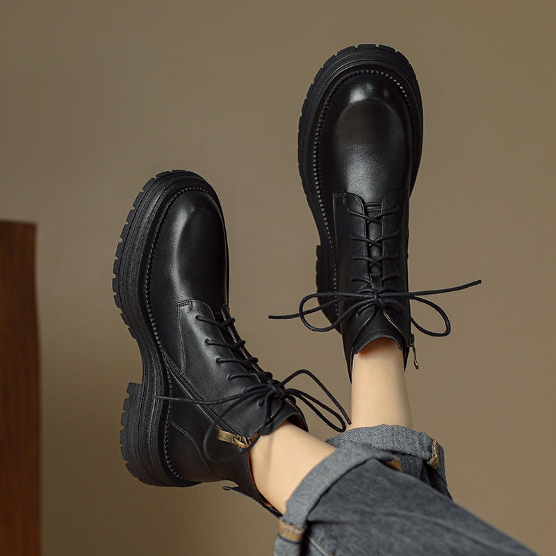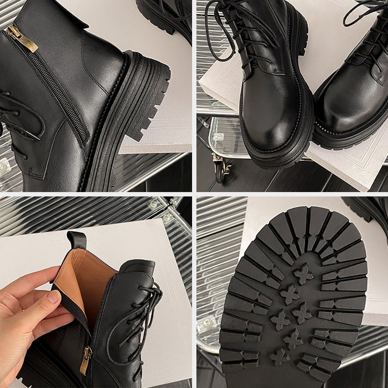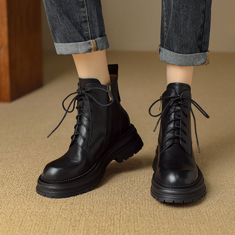 Crafted from premium water-dyed cowhide, these handmade vintage platform boots feature a round toe, side zipper, and lace-up design for easy wear. The TPR sole is soft, non-slip, and durable, with a genuine leather lining that keeps feet warm and comfortable all day. Stylish short combat boots that blend retro charm with everyday comfort.