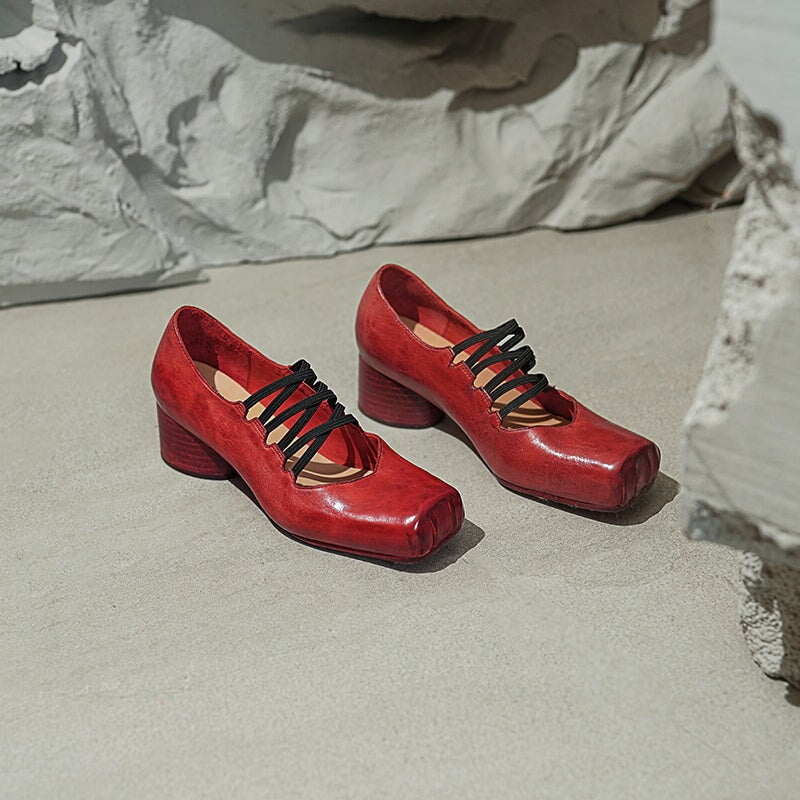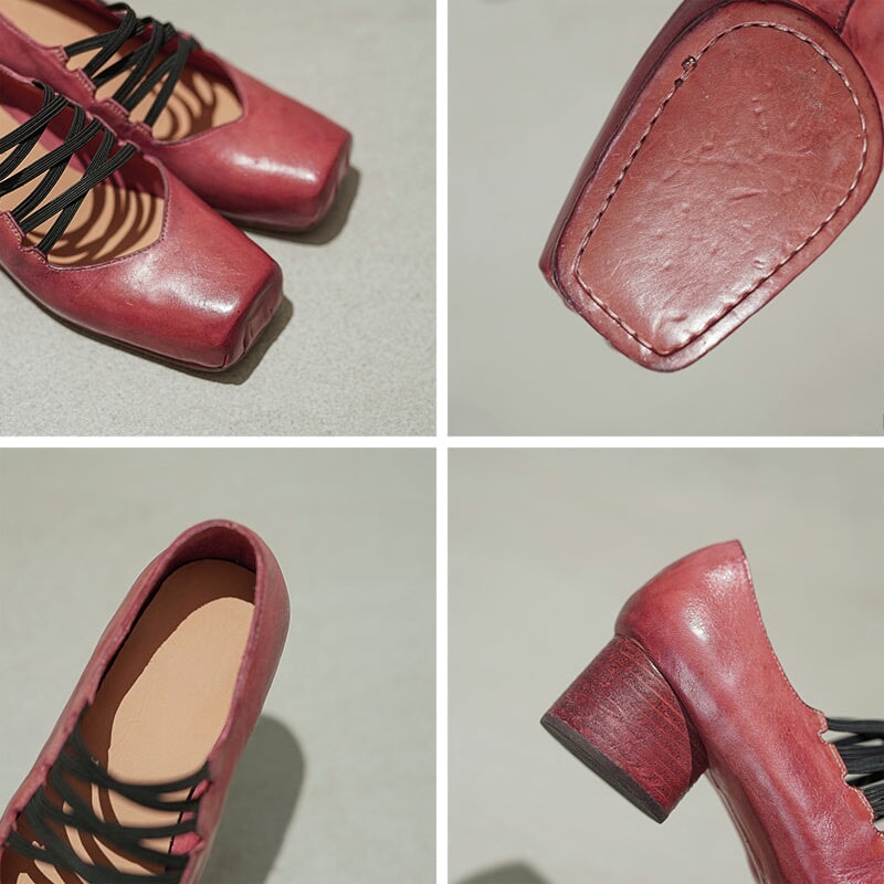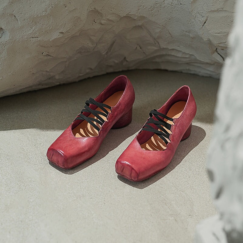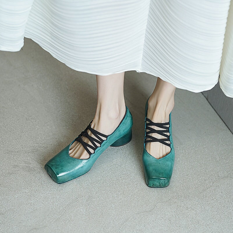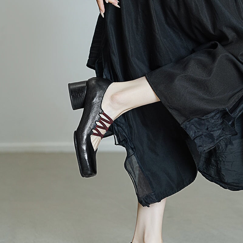 Elegant square-toe Mary Jane shoes crafted from premium washed horsehide leather. Featuring a unique ruched design, cross-elastic straps for a secure fit, and a comfortable cylindrical heel. The subtle gradient color adds a sophisticated touch, while the anti-slip sole ensures safety. Perfect for dance, casual outings, or vintage-inspired looks.