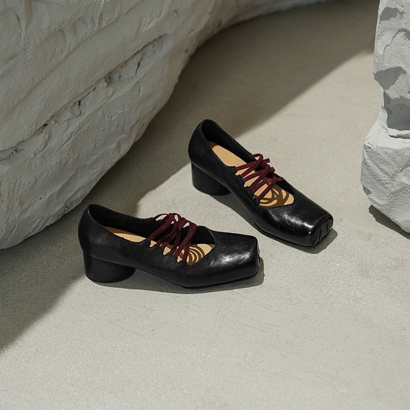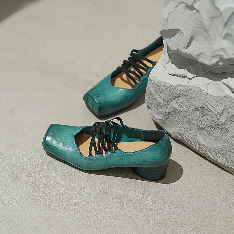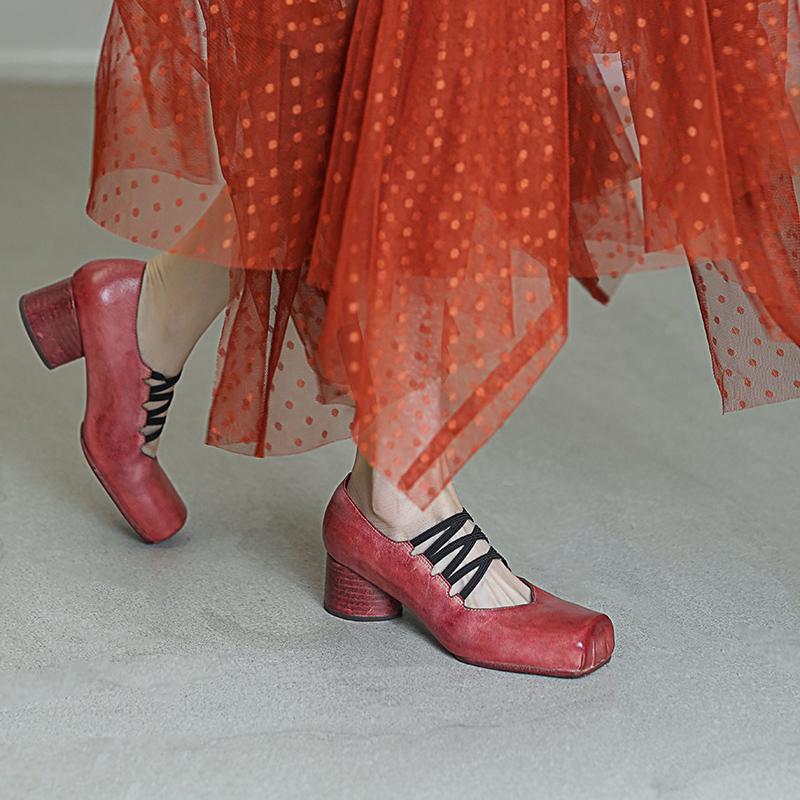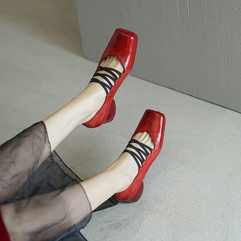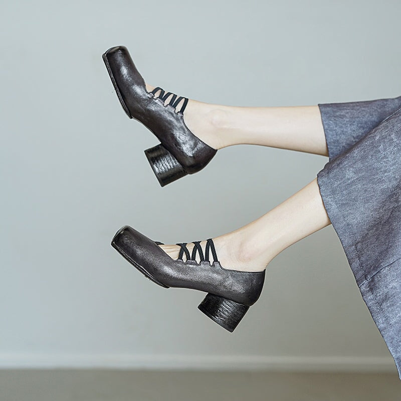 Elegant square-toe Mary Jane shoes crafted from premium washed horsehide leather. Featuring a unique ruched design, cross-elastic straps for a secure fit, and a comfortable cylindrical heel. The subtle gradient color adds a sophisticated touch, while the anti-slip sole ensures safety. Perfect for dance, casual outings, or vintage-inspired looks.