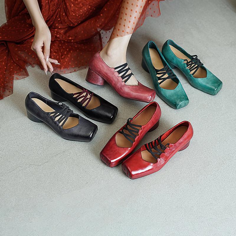 Vintage Mid Heel Square Toe Washed Horse Leather Mary Jane Ballet Shoes in Blue/Red/Black/Pink/Grey