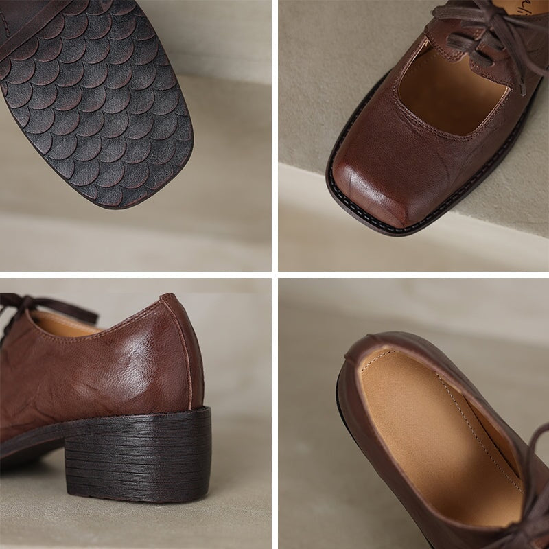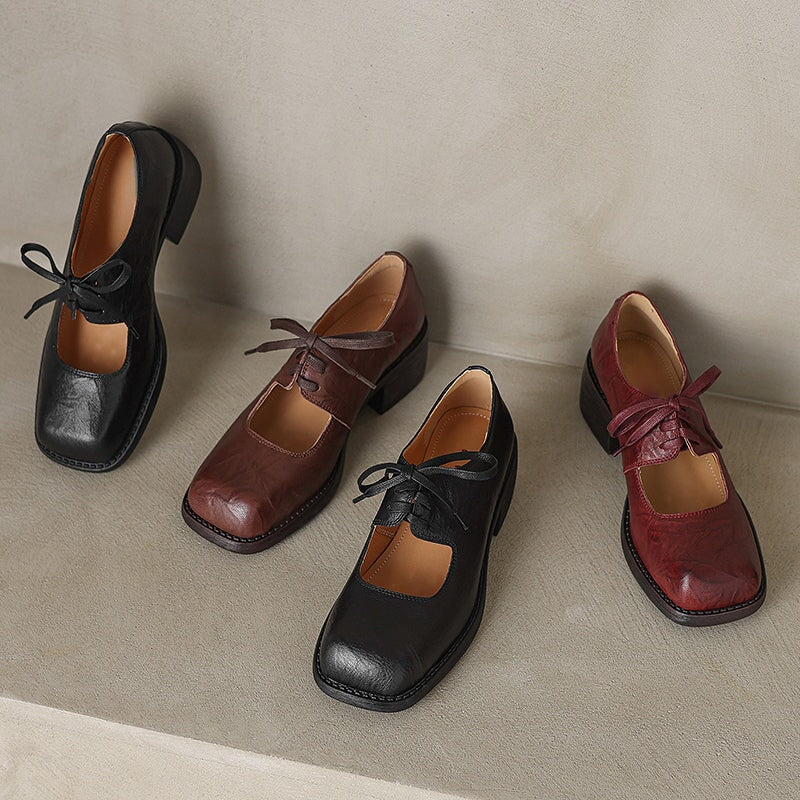 Vintage Square Toe Leather Mary Jane Shoes for Women with 50mm Block Heel in Black/Brown/Red