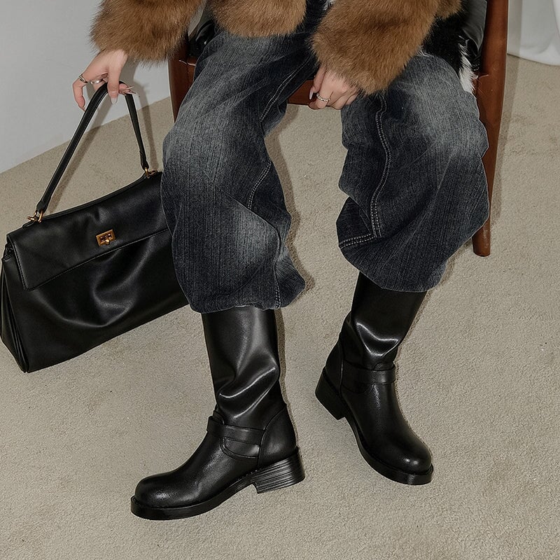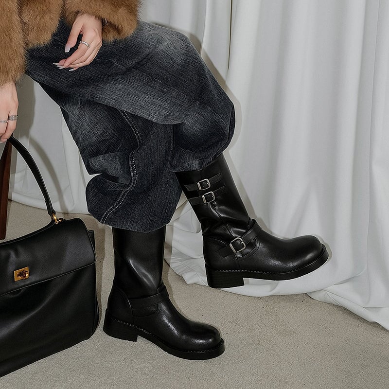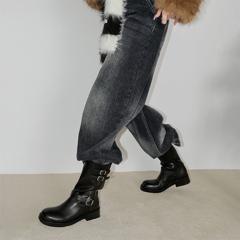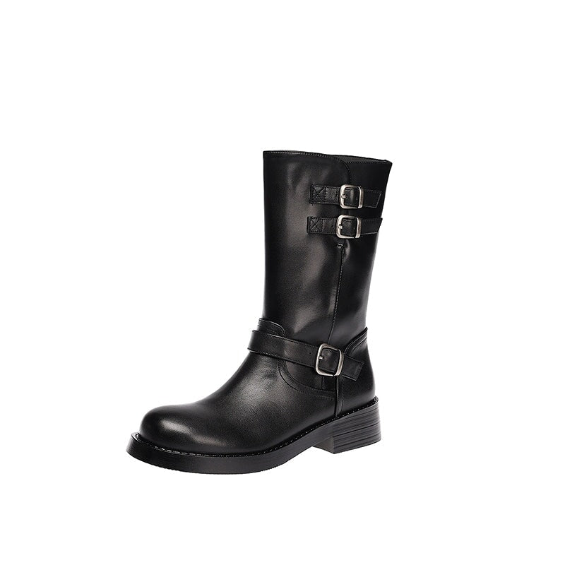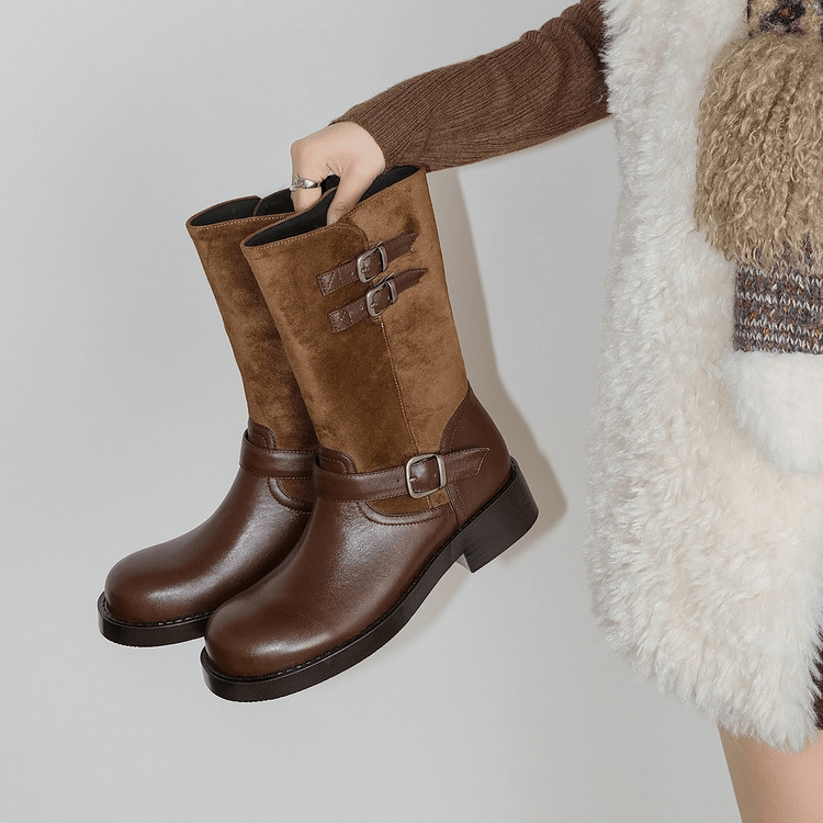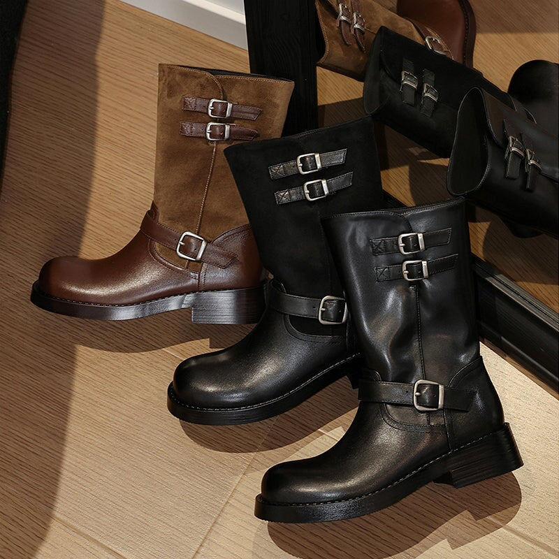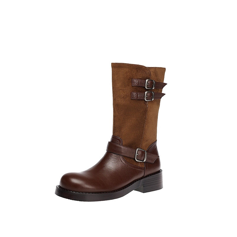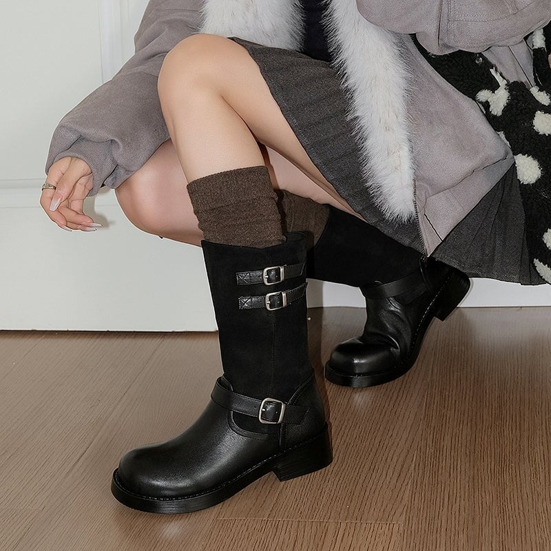 These women’s mid-calf biker boots made of full-grain leather and soft suede for a stylish vintage look. Designed with a round toe, sturdy block heel, and durable rubber outsole, they offer both comfort and long-lasting wear. Adjustable buckles add a classic biker-inspired edge. Available with short plush lining for winter warmth or a breathable leather lining for year-round comfort, making them a fashionable and versatile choice for any season.