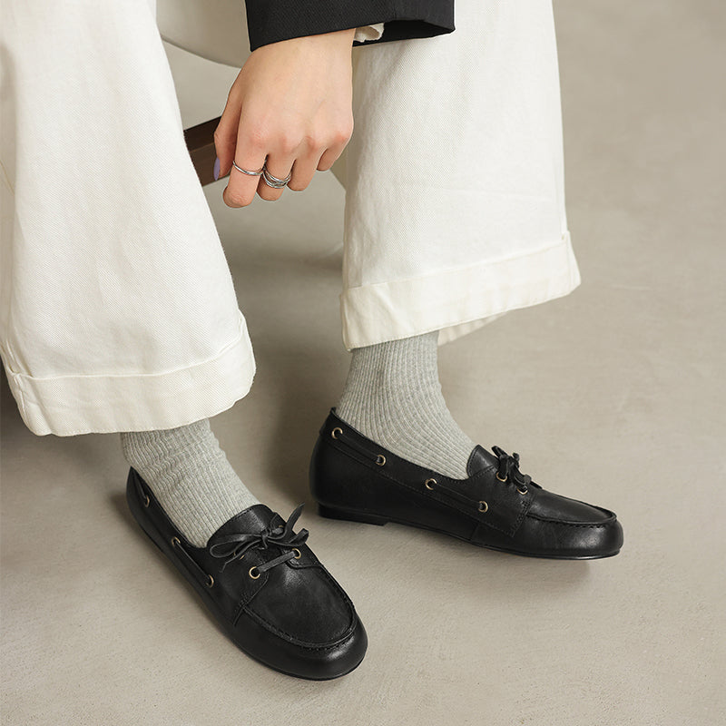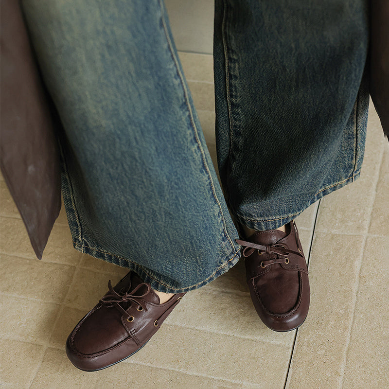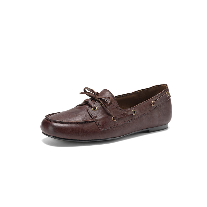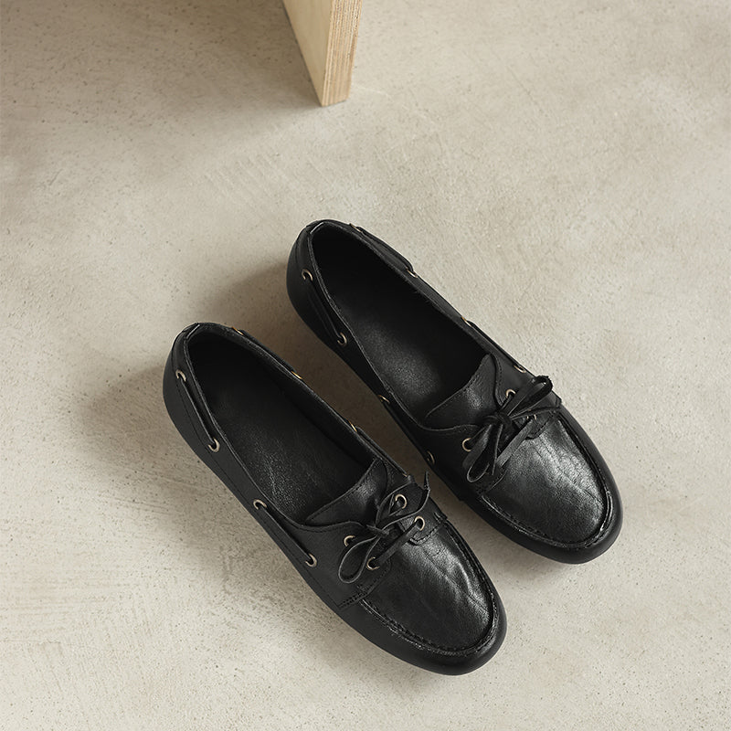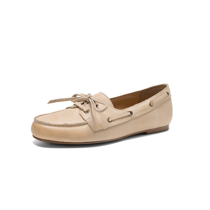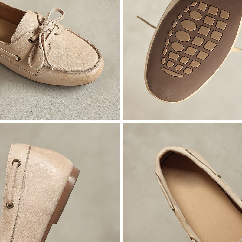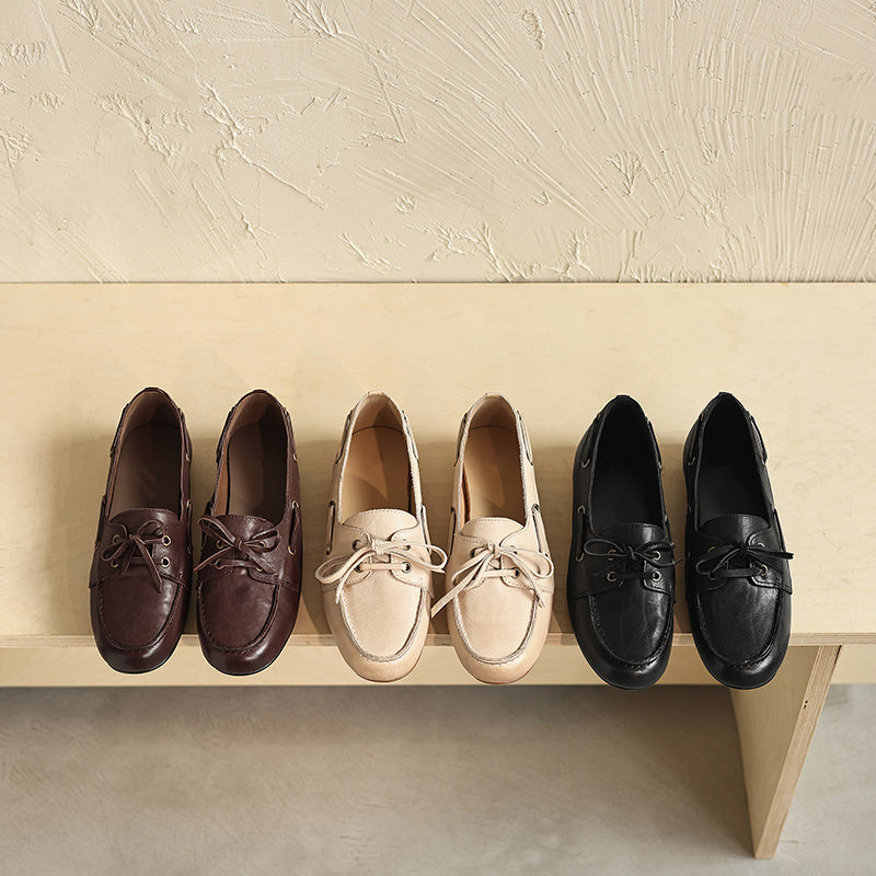 Women’s British Style Boat Shoes Cow Leather Lace-Up Casual Flats in Brown/Apricot/Black