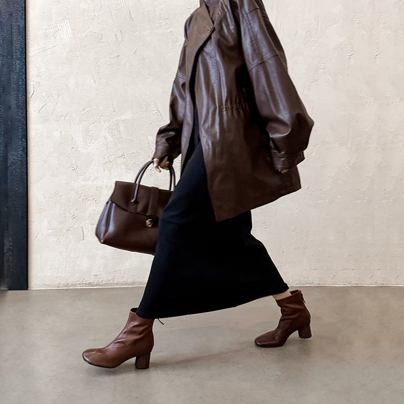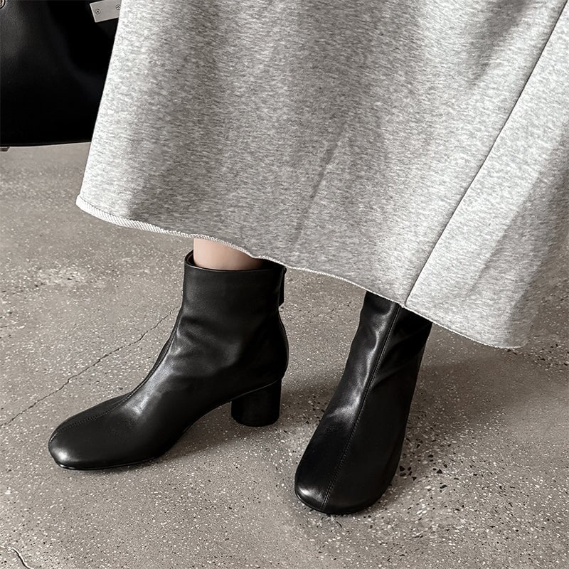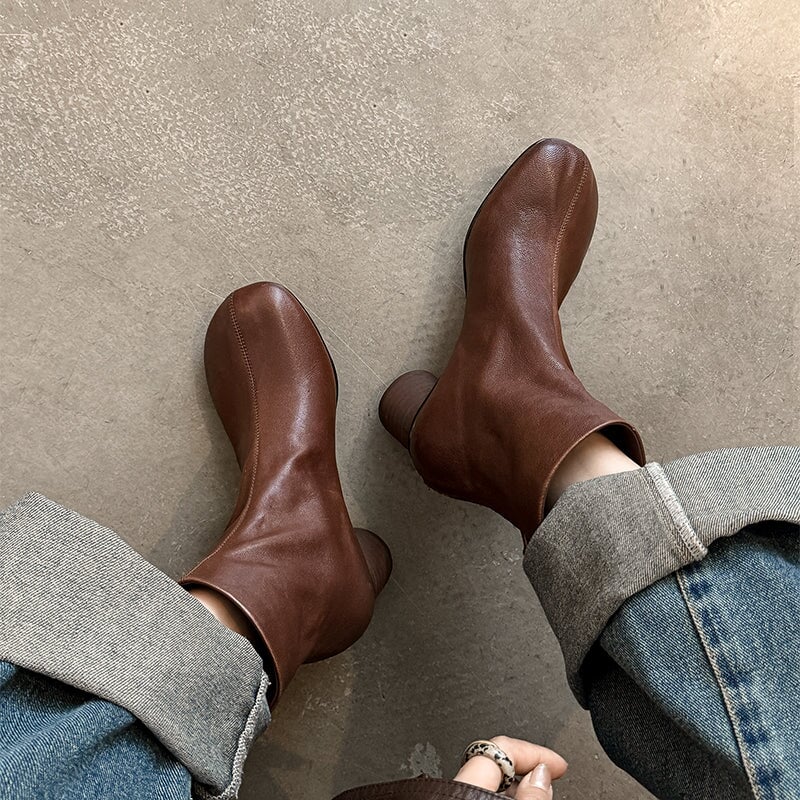 These vintage-inspired women’s ankle boots are crafted from premium washed full-grain cowhide leather, offering a soft texture and elegant, minimalist style. Designed with a round toe and a unique 53mm cylinder heel, they visually slim the legs while providing stable, comfortable height. The convenient back zipper makes them easy to slip on and off, and the durable rubber outsole ensures secure everyday wear. Available with short plush lining for warmth or leather lining for breathability, making them perfect for year-round wear. Perfect for fashion-forward outfits, casual looks, and retro-inspired styling.