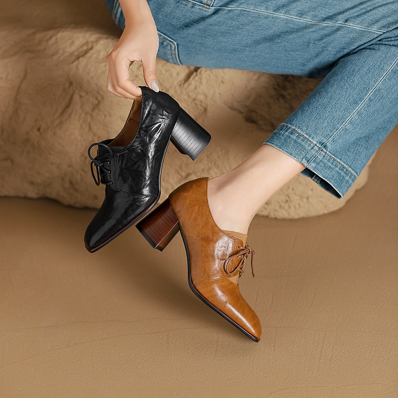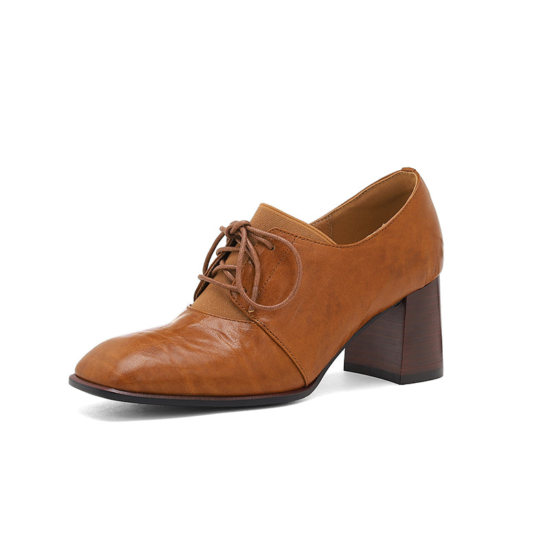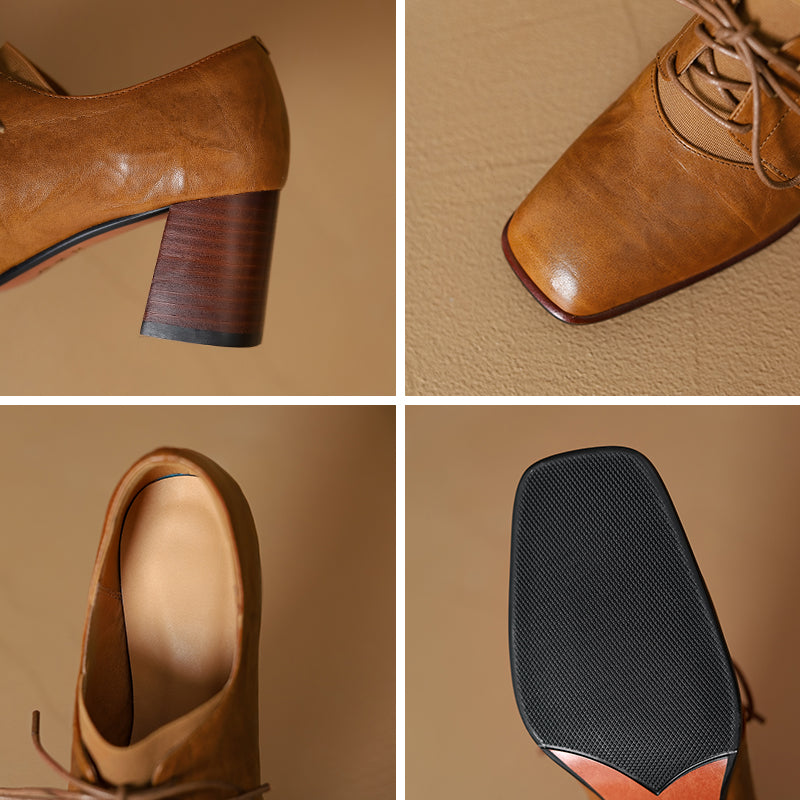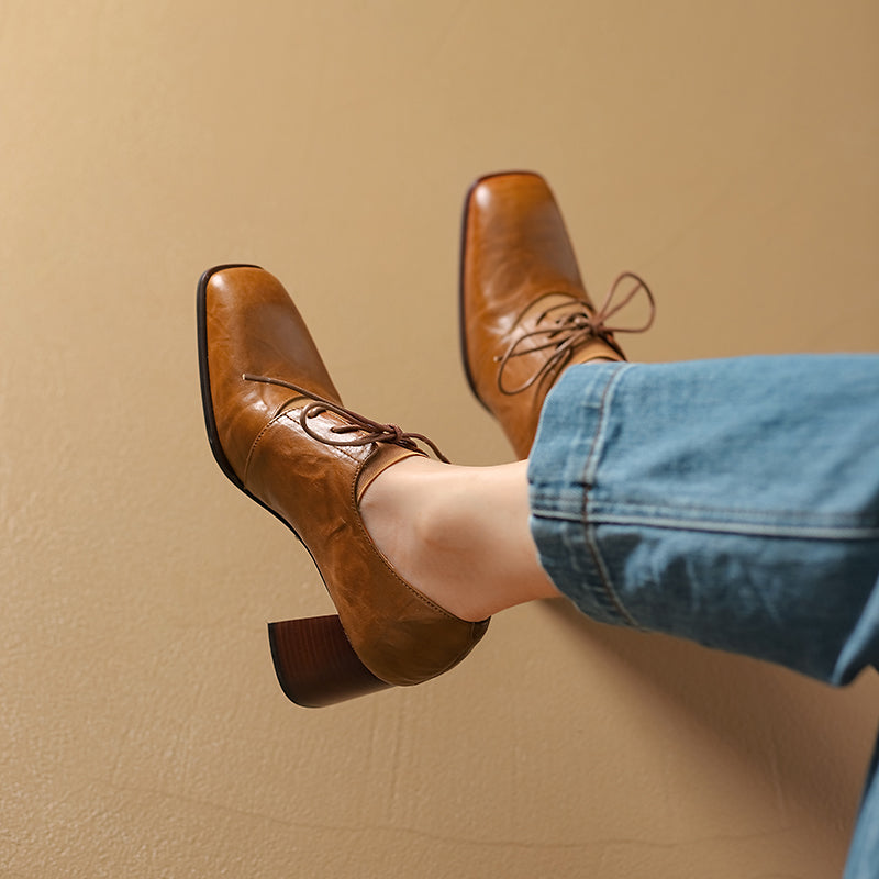 These retro-inspired square toe Oxford heels are crafted from premium hand-textured cow leather for a rich texture and durability. Featuring a lace-up design and sturdy 65mm chunky block heel, they offer both style and comfort. Finished with a non-slip rubber sole, each pair is carefully handmade by skilled craftsmen for lasting comfort and timeless vintage appeal.