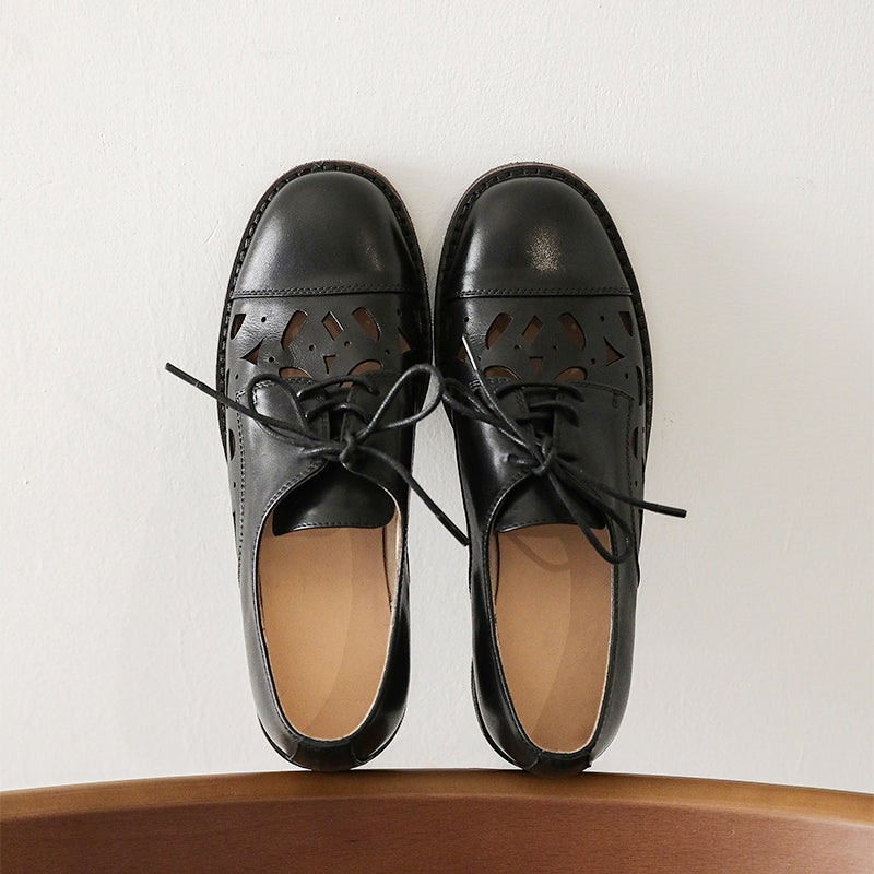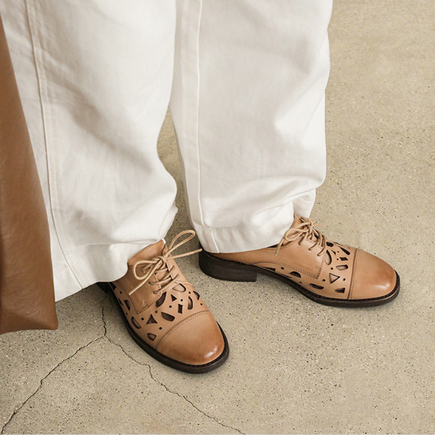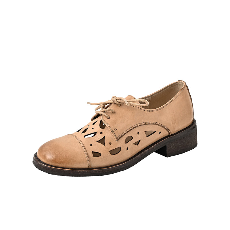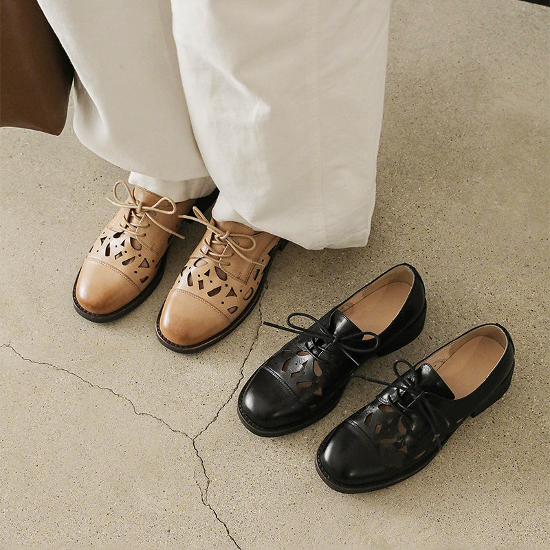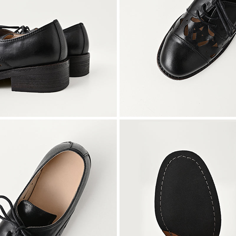 These summer cut-out Oxford shoes feature a breathable round toe design and classic lace-up closure for effortless casual style. Made from premium cow leather with a durable rubber sole, the block heel offers stable comfort for everyday wear. Each pair is carefully handmade by skilled craftsmen, delivering lasting comfort and timeless vintage appeal.