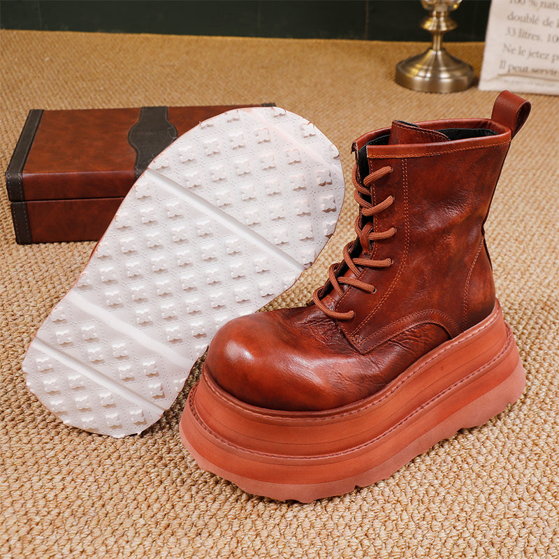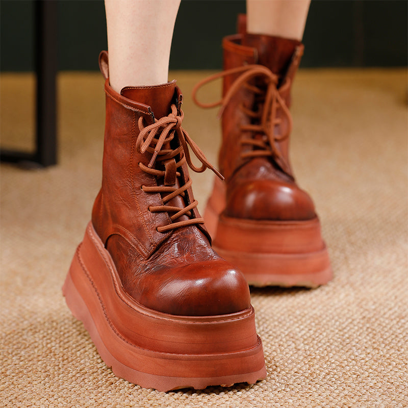 Women's Vintage Lace Up Chunky Platform Martin Boots Big Toe Leather Short Boots in Black/Brown