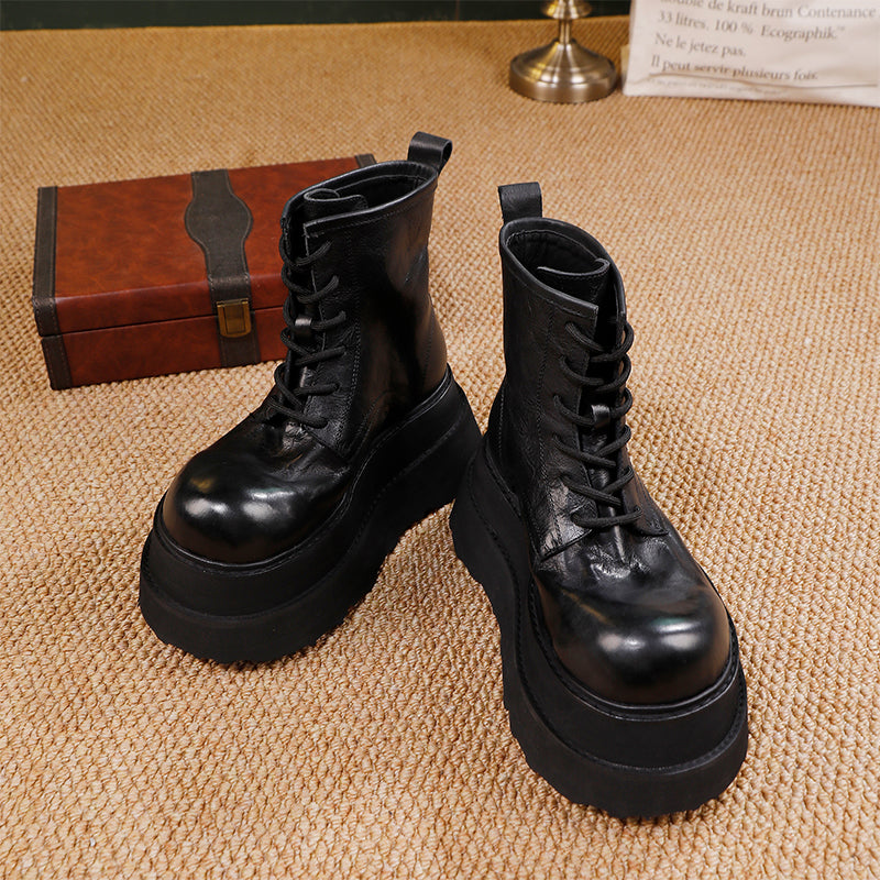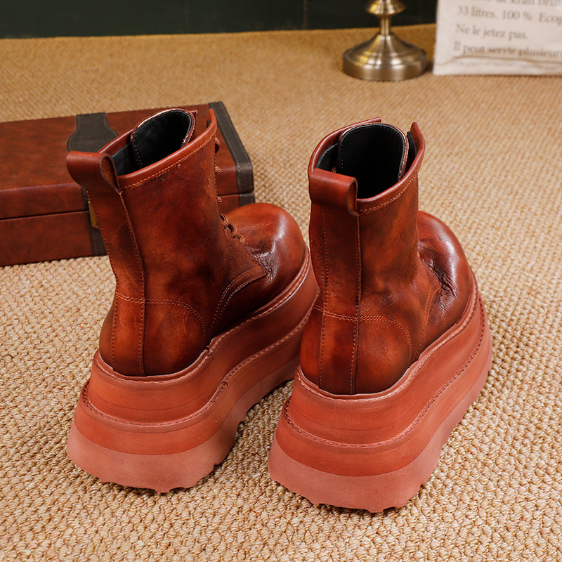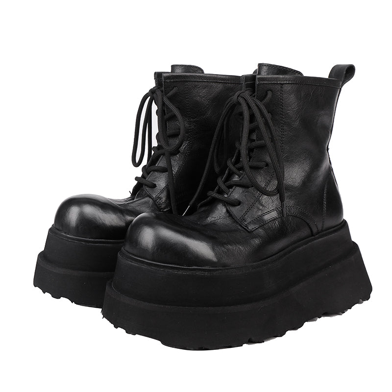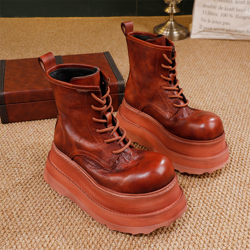 Step out in confidence with these 75mm high-heel chunky platform Martin boots. Crafted from premium washed cowhide leather, they feature a stylish round big toe and lace-up design for a perfect blend of retro charm and modern boldness. The rubber + EVA foam outsole is lightweight, soft, non-slip, and wear-resistant offering comfort and stability all day long. Each pair is handmade by experienced craftsmen, ensuring top-quality durability and timeless style that lasts for years.