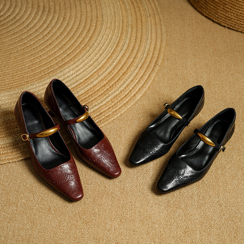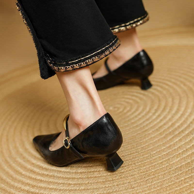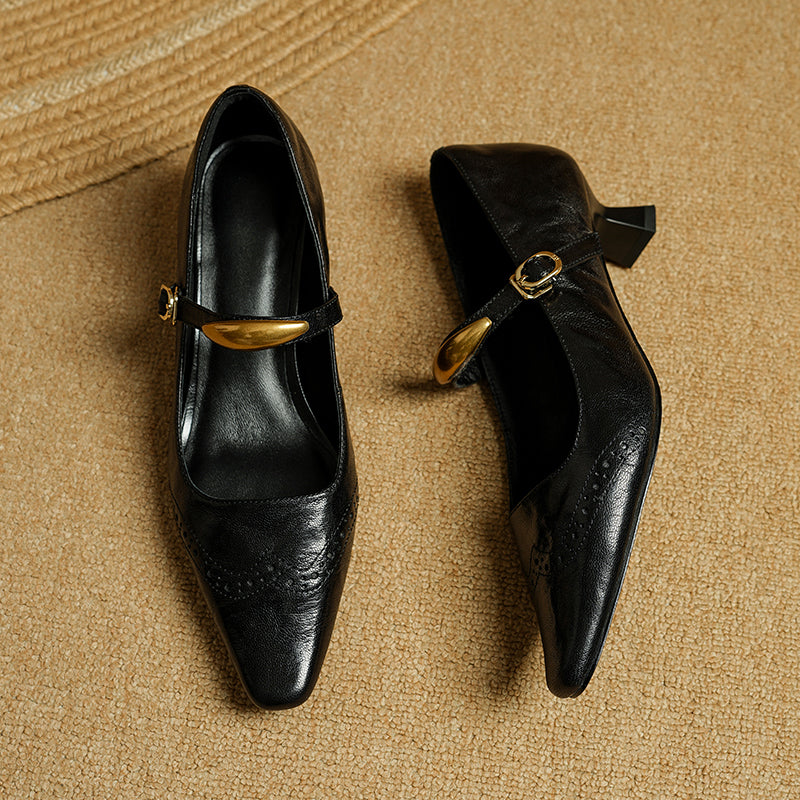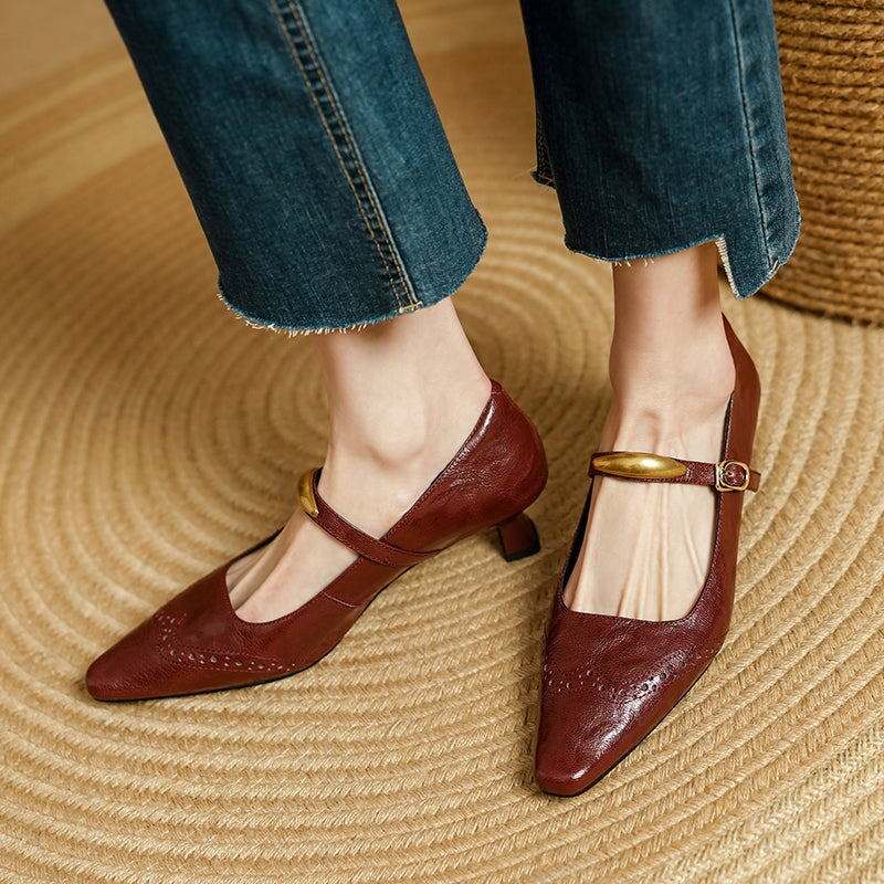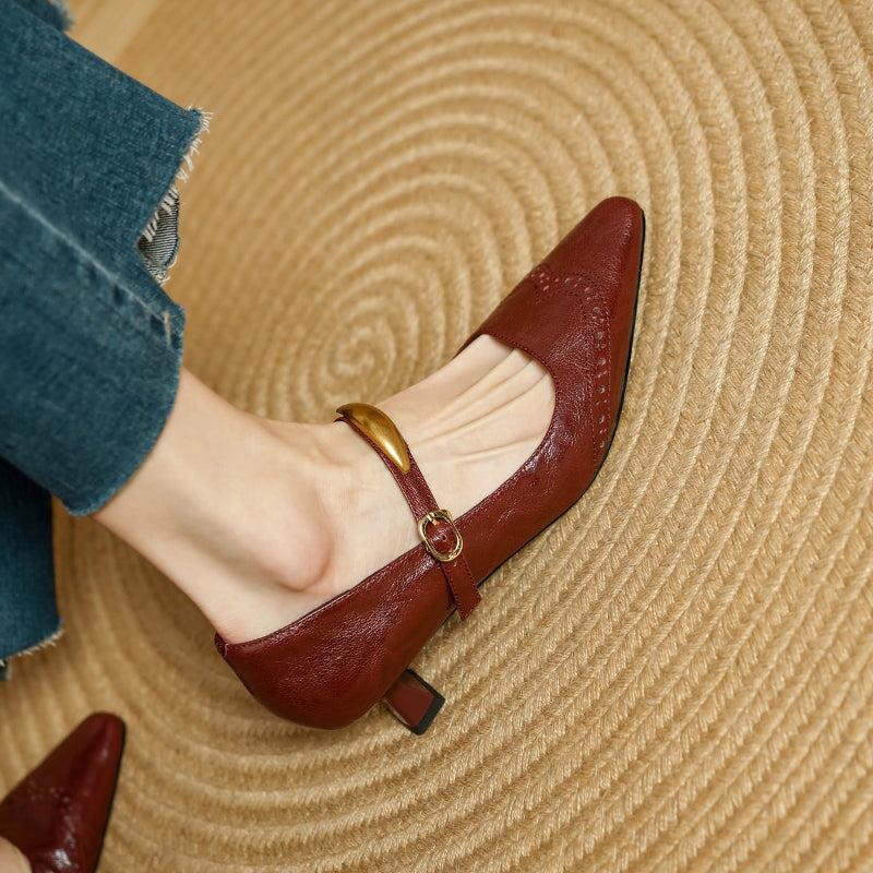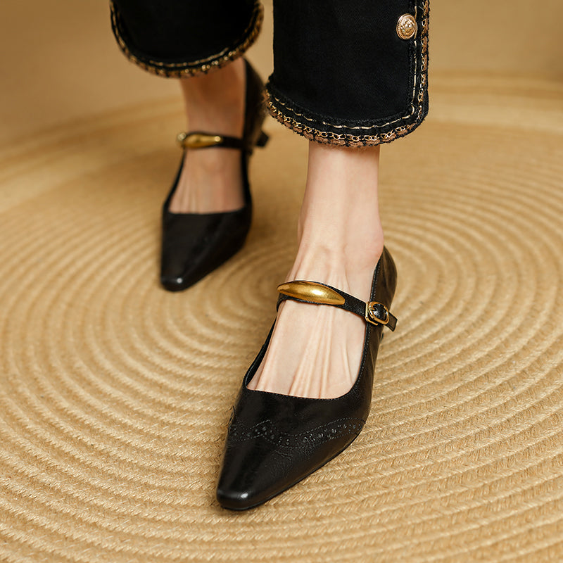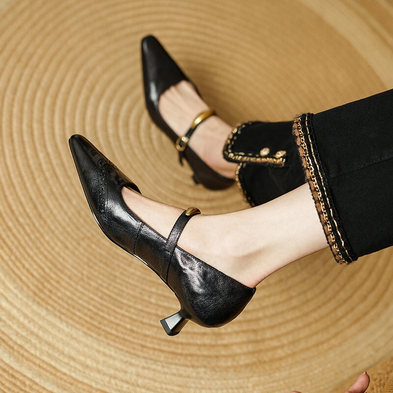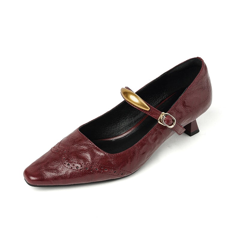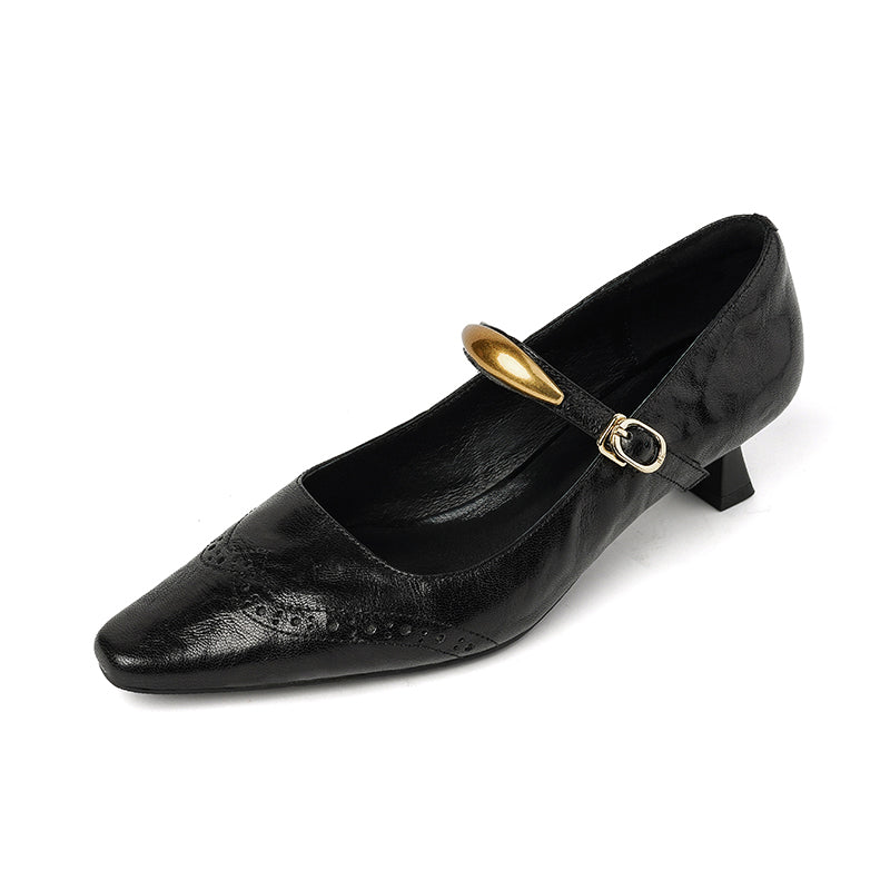 These vintage-inspired Mary Jane pumps feature a refined almond toe and classic brogue detailing, blending elegance with retro charm. Crafted from premium top-layer sheepskin leather, they offer a soft, supple feel with excellent breathability. The delicate metal strap design adds a subtle statement while ensuring a secure fit. A comfortable 40mm kitten heel provides everyday elegance and stability, and the durable rubber outsole delivers reliable traction. Perfect for work, dress occasions, or vintage styling, these pumps elevate both casual and formal looks with timeless sophistication.