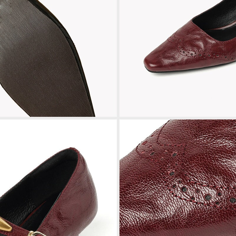 Women's Vintage Sheepskin Leather Brogue Mary Jane Pumps with Metal Strap Detail in Black/Wine Red