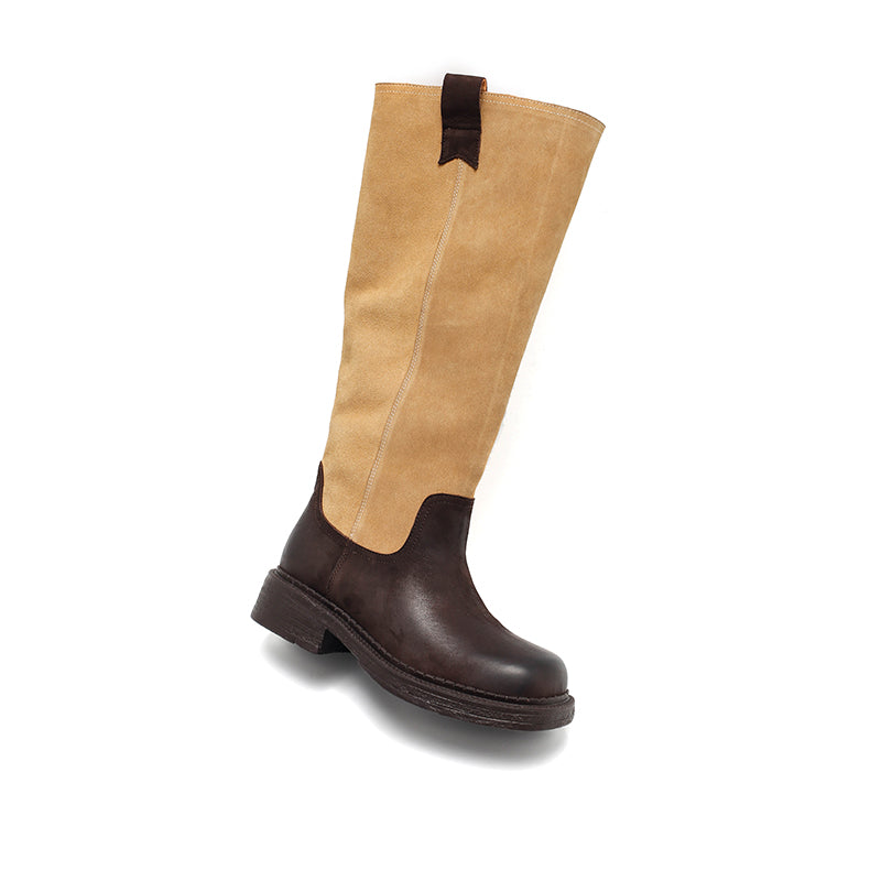 Dwarves Handmade Leather Two-Tone Knee-High Boots for Women Vintage Casual Boots in Dark Coffee and Dark Apricot