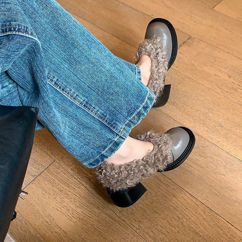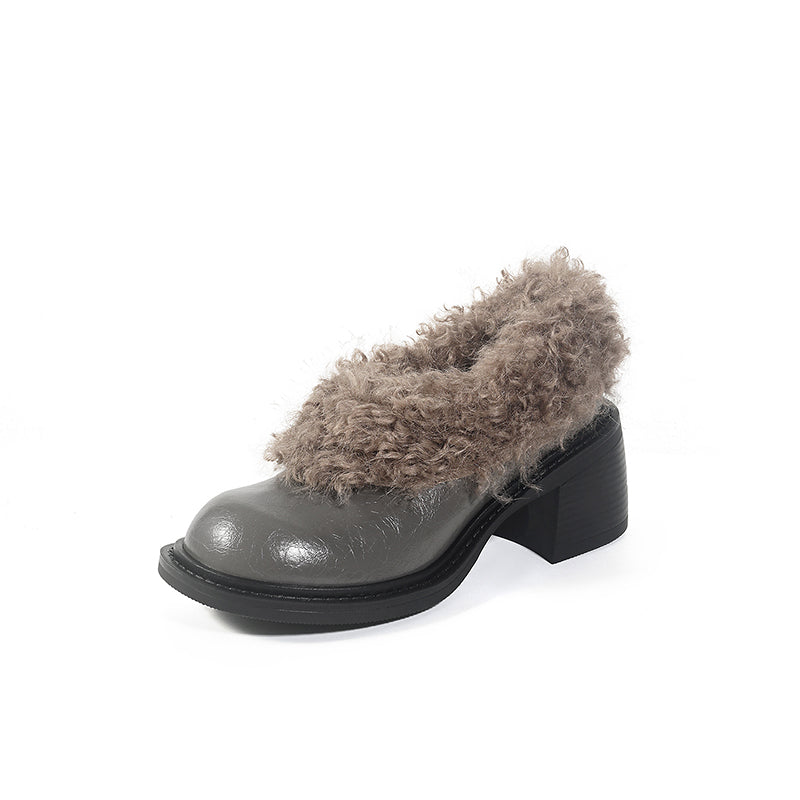 Women's Winter Cow Leather Shaggy Loafer Pumps Faux Fur Casual Shoes in Grey/Black/Beige